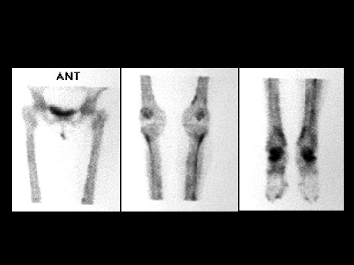 Hypertrophic osteoarthropathy • Findings: – Diffuse increased linear activity along the long bones • ddx: – Pulmonary disease – Pachydermoperiostosis – Vascular insufficiency – Thyroid acropachy – Fluorosis