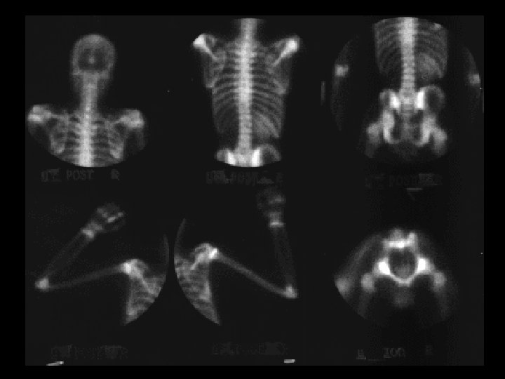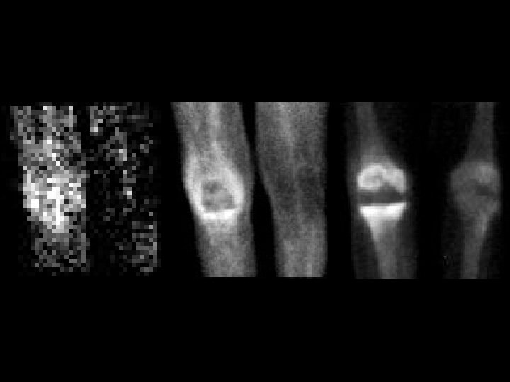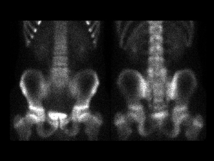 Osteopetrosis • • • Tc-99 m sulfur colloid, i. v. intense liver/spleen uptake, little or none in the bone marrow Trabecular --> compact bone --> Diffuse inc bone density Anemia w/extramedullary hematopoiesis ddx: (adults) – – – myelofibrosis sclerotic metastases renal osteodystrophy multiple myeloma Paget’s