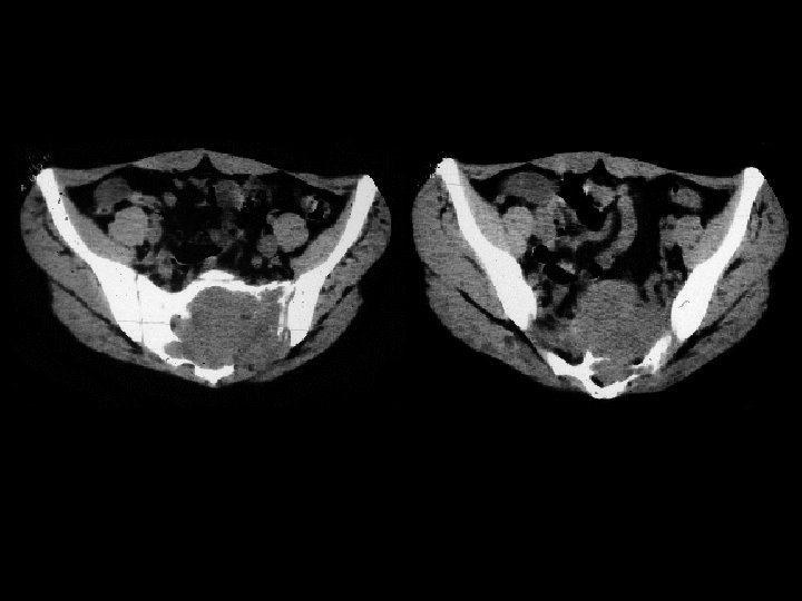 Giant cell tumor of the sacrum • Findings: – Cold lesion of the left sacrum • ddx: – RCC metastasis – Multiple myeloma – Abscess – Hematoma