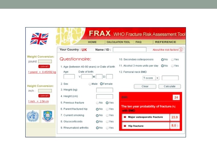 General Principles: • Obtain a detailed patient history pertaining to clinical risk factors for osteoporosis-related fractures and falls • Perform physical examination and obtain diagnostic studies to evaluate for signs of osteoporosis and its secondary causes • Modify diet/supplements and other clinical risk factors for fracture • Estimate patient’s 10 -year probability of hip and any major osteoporosisrelated fracture using the U. S. -adapted FRAX • Decisions on whom to treat and how to treat should be based on clinical judgment using this Guide and all available clinical information