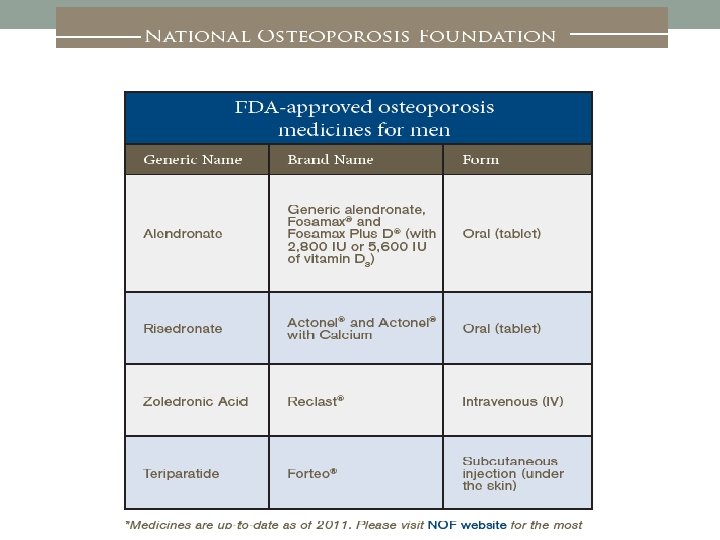 NOF 2010 Risk factors of male OP & broken bones: ♦ Age 70 or older ♦ Family history of osteoporosis or broken bones ♦ Age 50 or older and have broken any bones or lost an inch or more in height ♦ Certain medicines or have certain medical conditions that can cause bone loss