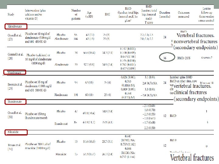 Results: Changes in BMD üGonnelli et al. : increase in BMD with Alendronate : LS 4. 2% , FN 2. 1% , Hip 1. 6% at year 1 LS 6. 3% , FN 3. 2% , Hip 2. 6% at year 2 LS 8. 8% , FN 4. 2% , Hip 3. 9% at year 3 ü Boonen et al. treatment with Risedronate 4. 5% (95% CI: 3. 5– 5. 6%; P < 0. 001) increase in lumbar spine BMD compared with placebo.