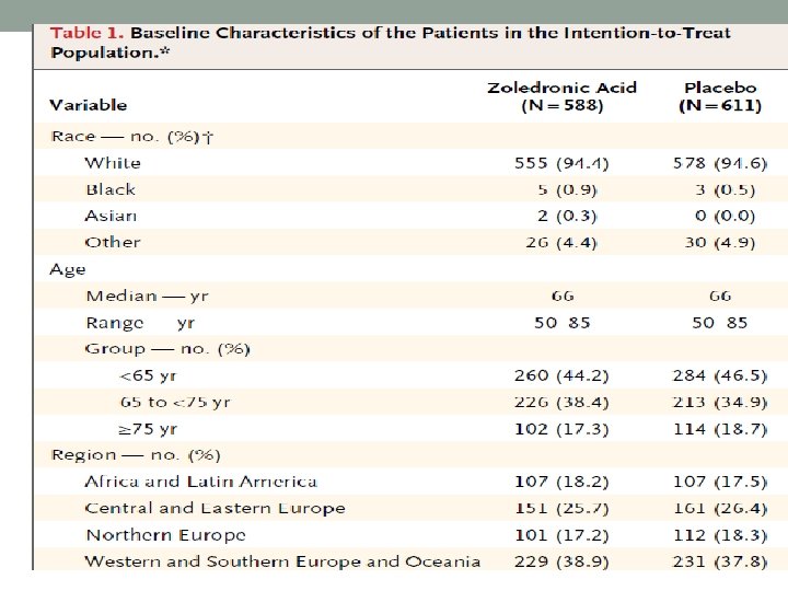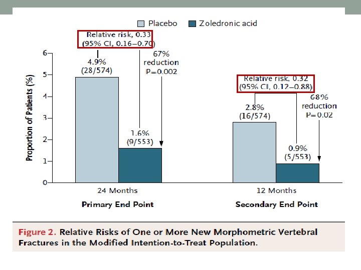 Intention- to – treat population n=1199 men, 50 to 85 years with osteoporosis at baseline and at 12 months n=588 Zoledronic acid (5 mg)/IV n=611 Placebo Primary end point : The proportion of men with one or more new morphometric vertebral fractures over 24 months