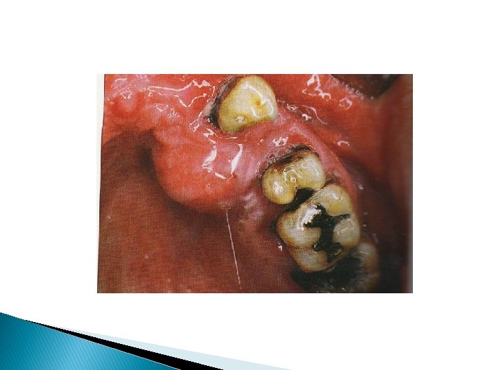 Étude clinique Ostéites de cause locale ⇒ Abcès sous périosté: Enfant + adulte - Régions où le périoste adhère à la muqueuse Ø Au palais: - Adulte+++. - Racines de: IL, 1ère PM et 1ère M. - Voussure fluctuante, douloureuse. - Muqueuse œdémateuse, congestionnée. - Disparition lente. -