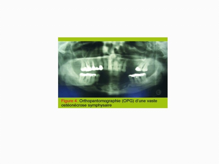 Desmodontite chronique sur la 37, se compliquant d’une cellulite génienne Deux mois après extraction de la 37, persistance de la suppuration et importante atteinte osseuse à la radio