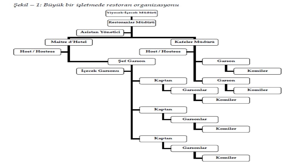 2. Amerikan Sistemi Fransız sistemiyle Amerikan sistemi arasında bazı farklılıklar vardır. Temel fark Amerikan sisteminde ölçeklerin ve kapasitelerin büyük olmasıdır. Amerikan sisteminde Mutfak Şefi, iyecekiçecek Müdürüne bağlanmıştır. Servis şefi ile servis elemanı arasına Kaptan (captain) getirilmiştir. Kaptan 20 – 25 masanın sorumluluğunu ve siparişlerini alır. Otelcilikte sipariş alırken kullanılan Sipariş fişinin, captain order olarak adlandırılması Amerikan servis sisteminden gelmektedir. Beş yıldızlı ve büyük ölçekli bir yiyecek-içecek işletmesindeki Amerikan rütbe sistemi şu şekildedir: • Food & Bevarage Manager (Yiyecek-İçecek Müdürü) • Assistant Food & Bevarage Manager (Yiyecek-İçecek Müdür Yardımcısı) • Restaurant Manger (Restoranlar Müdürü) • Head Waiter (Servis Şefi) • Captain (Kaptan)