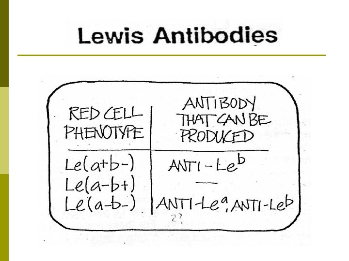 Lewis Antibodies p Anti-Le a, Anti-Le b, Anti-Lex p Most react at room temperature or below - p Often fix complement p Some in vitro hemolysis p Le a may cause HTR