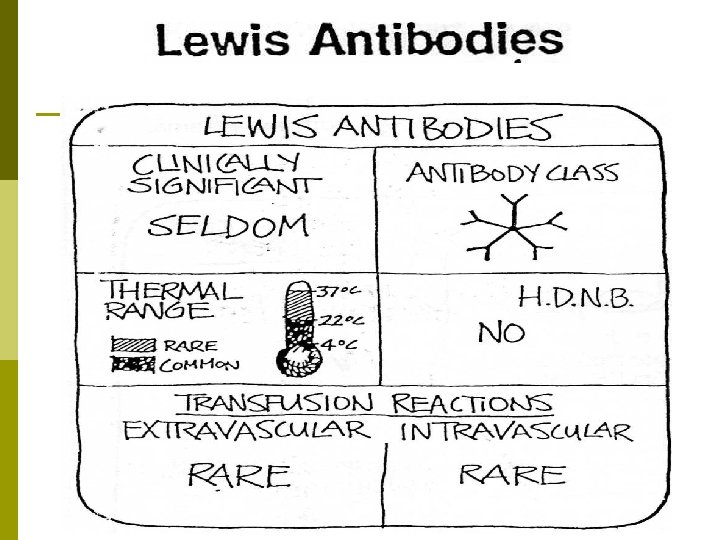 Lewis Antibodies p Anti-Le b p Often found with Anti-Lea p Most react at room temperature or below p Two types - Anti-Leb. H and Anti-Leb. L p Rare cause of HTR