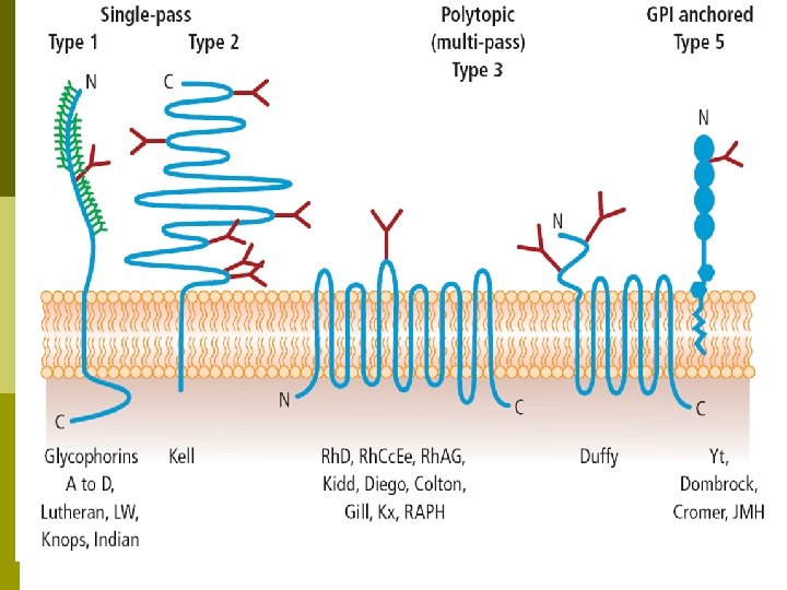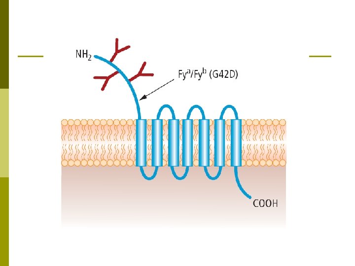 Duffy Blood Group System p The Duffy blood group was discovered in 1950. p The Duffy glycoprotein is encoded by the FY gene, found on chromosome 1 , of which there are two main alleles, FYA and FYB. They are codominant. p The Duffy gene codes for a glycoprotein also found in other tissues: brain, kidney, spleen, heart and lung. p The Duffy glycoprotein is a transmembrane protein p Five alleles at Duffy locus, the most important: Fya, Fyb & Fy (Silent Allele) p Fya is more immunogenic than Fyb