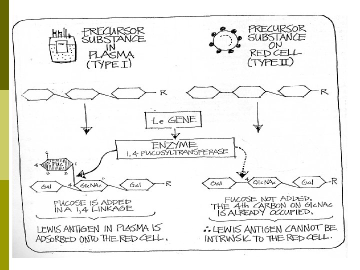 Lewis System p Lewis antibodies n Can be neutralized in-vitro by additions of Lewis Substance p p p Le antigens are present in secretions Add to serum with Lewis antibodies and the antibodies will be bound to the soluble Lewis antigens Useful when multiple antibodies are present and 1 is a Lewis, eliminates the activity of the antibody