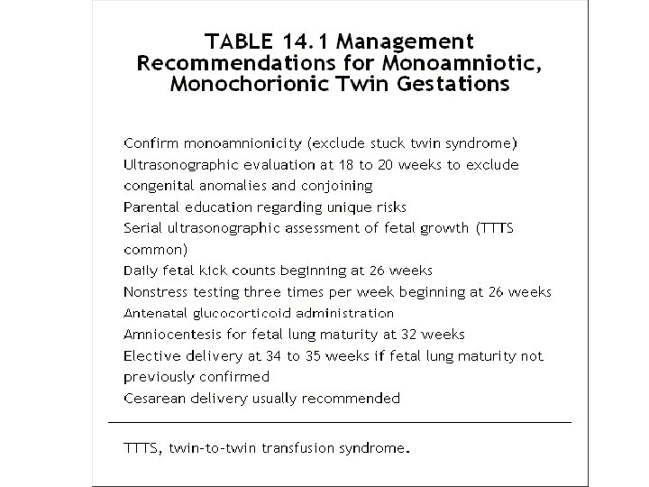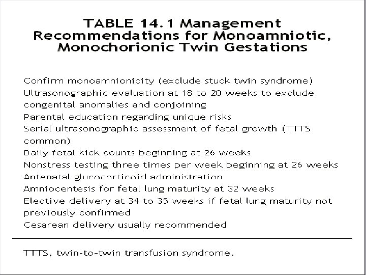 Monoamniotic Twins *They carry a fetal mortality rate that approaches 40%, primarily as a consequence of cord entanglement and subsequent occlusion *they are at greater risk for other complications: -congenital anomaly -TTTS *Cesarean delivery is usually recommended