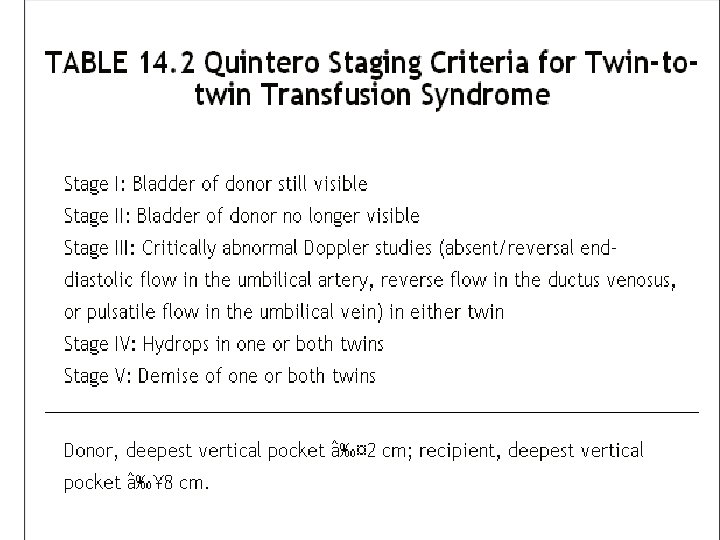 Treatment *depending on the Quintero stage and the gestational age at which it is encountered *The option of delivery will depend on fetal maturity and the potential morbidity that would be encountered *At earlier gestational ages: -serial amniocentesis -tocolytic therapy -fetoscopy ! Viable patient: large volume-reduction amniocentesis ! previable patient: intrauterine laser ablation of placental surface vascular anastomoses, fetoscopic cord clamping, or termination