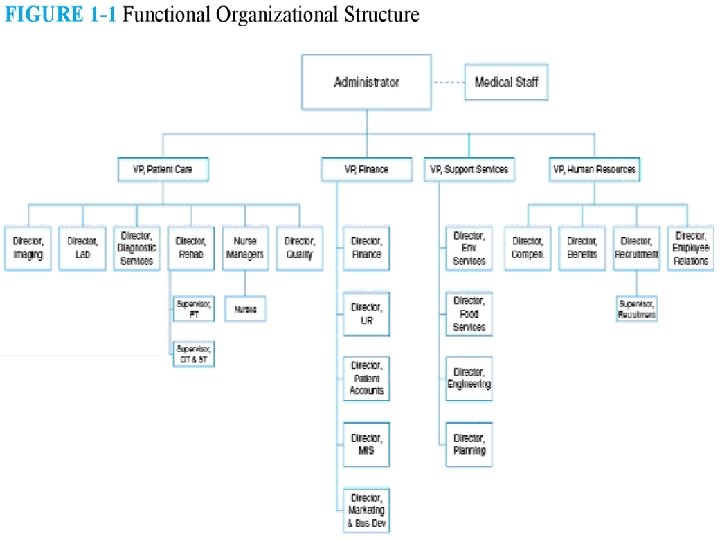 Board Administration Information Therapeutic Services Admissions Billing, etc. Med. Records Computer Info. Health Ed. Human Resour. PT, OT Speech/Lang. Resp. Therapy Pharmacy Nursing Dietary Diagnostic Services Med. Lab Radiology Nuclear Med ER Cardiology Neurology Support Services Central Supply Biomedical Housekeeping Maintenance Dietary Transportation