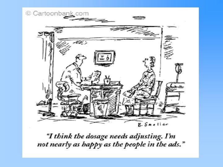 Side Effects • SNRIs – Venlafaxine (Effexor) • Elevated B/P - diastolic – Duloxetine (Cymbalta) • Blurred vision, mydriasis (dilated pupils – can affect vision) • Atypical Antidepressants – Mirtazapine (Remeron) • Sedation • Weight gain • No sexual side effects