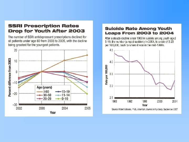 Antidepressant Black Box • The most serious warning possible on drug packaging in the USA • To apply to ALL antidepressants for children and adolescents < 25 yrs old • Explicit about the increased risk of suicide especially during the early phase of tx • No completed suicides in studies reviewed • Review of studies showed increased suicidal thoughts (2% to 4%) through adverse event reporting