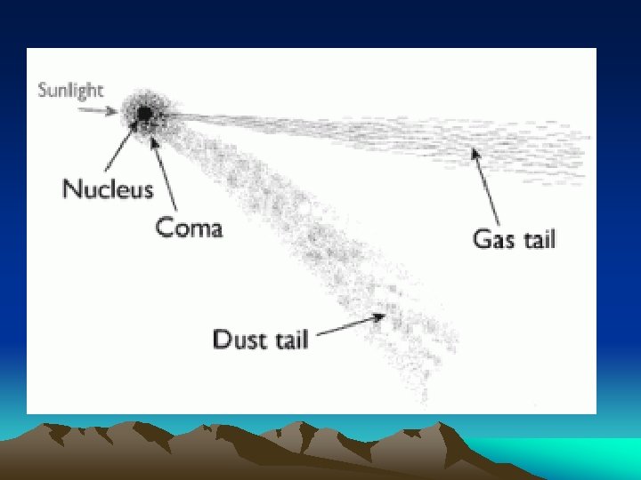 Comets • Comets are composed of dust and rock mixed with frozen water, methane, and ammonia • Comets are considered to be like a large, dirty snowball