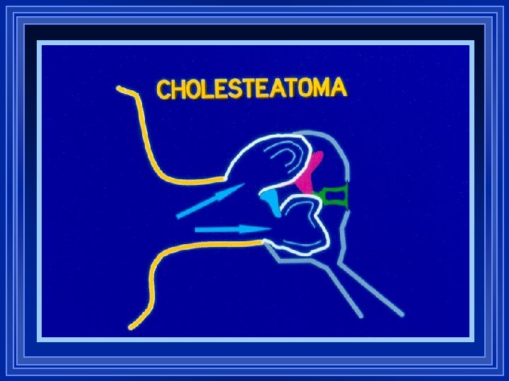 Cholesteatoma l Accumulation of squamous epithelium in middle ear & mastoid l Osteolytic enzymes l Often accompanied by chronic otorrhea