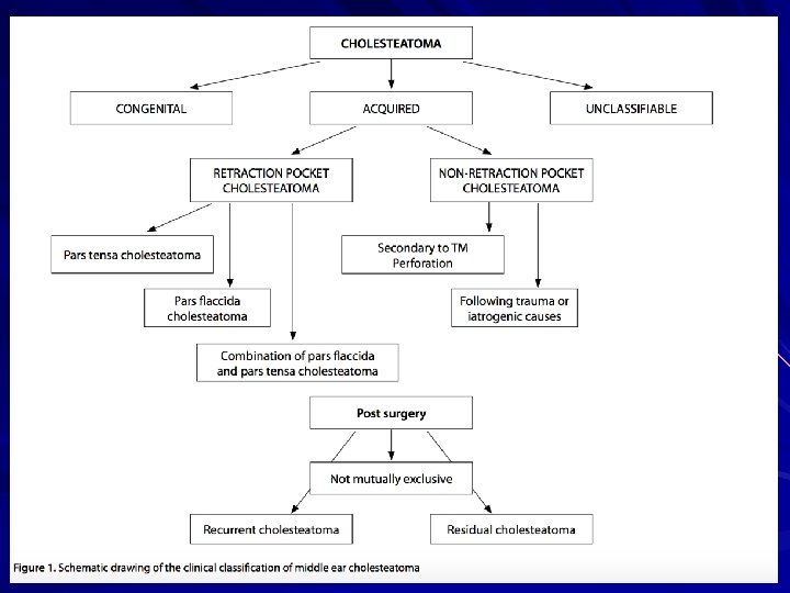 Etiopathogenis intact tympanic membrane - primary congenital (amnion fluid, Aimi‘s theory) - primary acquired (invasion, metaplasia, inclusion) tympanic membrane with defect - primary acquired (retraction pocket, papillary proliferation) - secondary acquired (perforation)