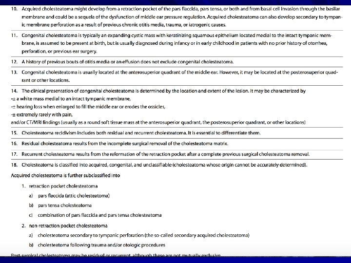 Ot. med. supp. chron. cholest. Diagnosis Marginal (but not always) “perforation” (which is actually the mouth of a “sack”) may be covered by crust (op. microsc. !) White debris of keratin Foetid pus “Sentinel” polyp X-ray, CT (bone destruction) MR-DW