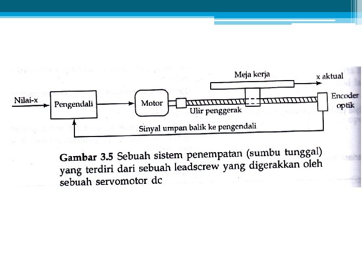 Sistem Penempatan Jaringan Tertutup • Dalam operasi pada gambar, sistem digunakan untuk menggerakkan Work Table ke lokasi seperti yang ditentukan oleh nilai koordinat; • Umumnya sistem penempatan memiliki paling sedikit dua sumbu dengan satu sistem kendali untuk setiap sumbu (dalam gambar hanya satu sumbu); • Servomotor DC dihubungkan dengan Leadscrew yang merupakan aktuator untuk setiap sumbu; • Suatu signal yang menunjukkan nilai koordinat dikirimkan dari Controller ke Motor, dan menjalankan Leadscrew dimana gerakan memutar ulir dikonversikan menjadi gerakan linear ke posisi meja yang dikehendaki; • Posisi X yang sesungguhnya diukur oleh Optical Encoder, dan perbedaannya dengan nilai koordinat X yang dikehendaki, oleh Controller digunakan untuk menggerakan Motor kembali hingga posisi meja sesungguhnya sesuai dengan nilai posisi input. • Lihat gambar 3. 5