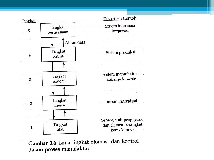 Level Otomasi • Konsep sistem otomasi dapat diterapkan dalam berbagai level operasi-operasi manufaktur • Terdapat lima kemungkinan level otomasi, yaitu : 1) Level peralatan (device level) 2) Level mesin (machine level), 3) Level sel atau sistem (cell or system level), 4) Level pabrik (plant level) 5) Level perusahaan (enterprise level). • Lihat gambar 3. 6
