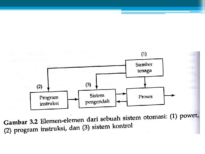 Elemen Dasar Sistem Otomasi Sistem terotomasi terdiri dari tiga elemen dasar, yaitu: • Daya (power) untuk menyelesaikan proses dan mengoperasikan sistem, • Program instruksi (program of instructions) untuk mengarahkan atau mengatur proses, • Sistem kendali (control system) untuk melaksanakan instruksi. Lihat gambar 3. 2