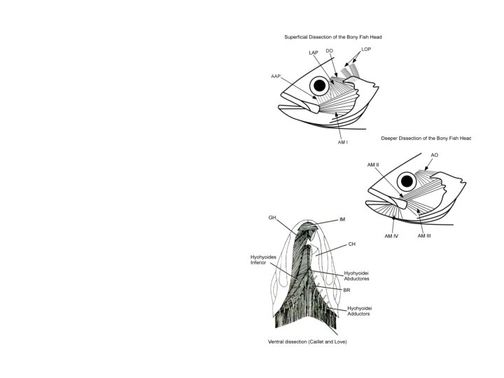 Mouth muscles • Adductor mandibulae (A 1 A 2 A 3) = cheek muscles - close jaws; • Levator arcus palatini - post orbital part of cheek, Dilator operculi, adductor operculi , levator operculi - insert on opercle • Adductor arcus palatini, • Adductor hyomandibulae