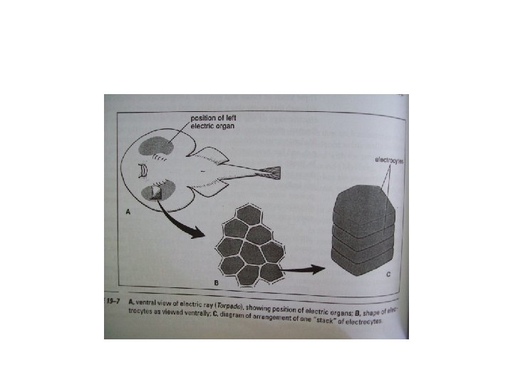 Organ berlistrik • ORGAN BERLISTRIK • Modofikasi dr sel-sel urat daging, biasanya terdapat pada batang ekor tdr dr 4 tumpukan keping ELECTROPLATE. • Tiap keping tdr dr zat spt agar-agar yg halus di satu sisi dan di sisi lainnya kasar • jika syaraf memberi rangsangan baru ada aliran (+) & (-) • keping tersusun scr seri shg mkin banyak mkin besar voltasenya.