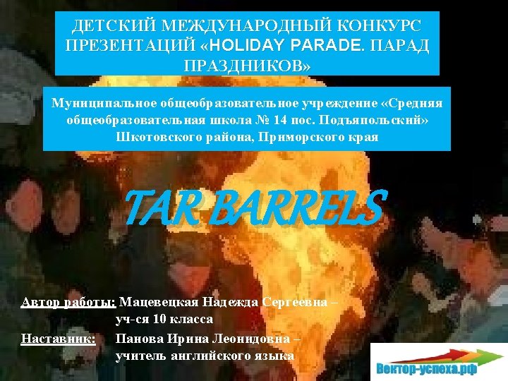 Holiday? Yes, it has started! � � � From 4 pm there are smaller barrels for children and ladies. Then a huge bonfire is lit near the riverbank at 6. 30 and the men’s barrels start to appear in turn around 7. 30 pm. Each barrel is sponsored by a pub and lit outside it. The action takes place around The Square, Mill Street and Yonder Street area. As if this isn’t enough to brighten the darkest of November evenings, there is also a funfair and the firing of the Rock Cannons. The handheld miniature cannons are fired throughout the day on 5 th of November, as a prelude to the Ottery St Mary Flaming Tar Barrel carnival If you want to find them, just look out for groups of people striding purposefully around the town or listen to the bangs that follow the smoke. (1) (http: //www. youtube. com/watch? feature=player_embedded&v=Nwkfx 16 H 9 h 8)