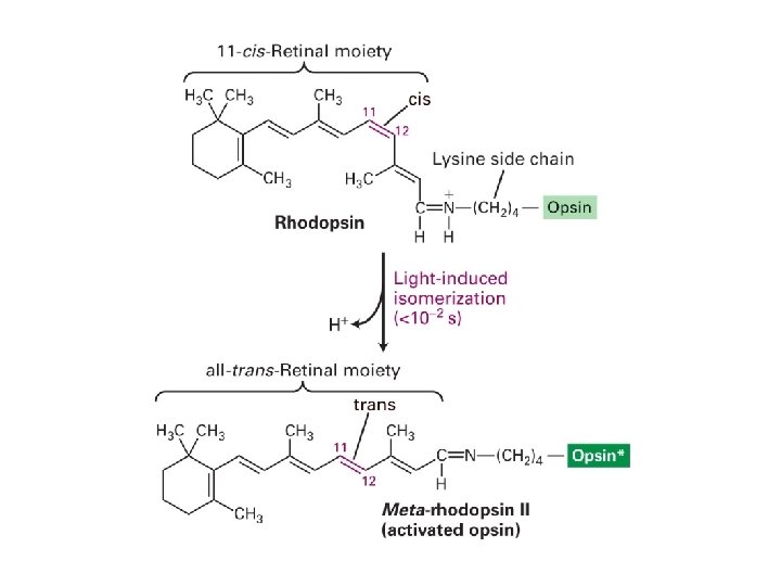Activation of rhodopsin by a photon-converting a light energy of A photon into atomic motion -The isomerization causes the Shiff-base nitrogen to move approximately 5 A, assuming that the cyclohexane ring of the cis-retinal group remains fixed/ -Inverse agonist- 108 Rhodopsin molecules /cell