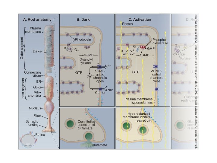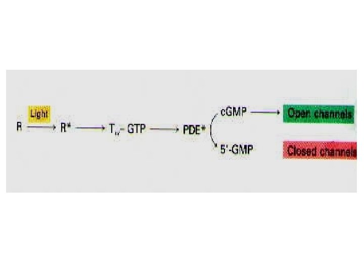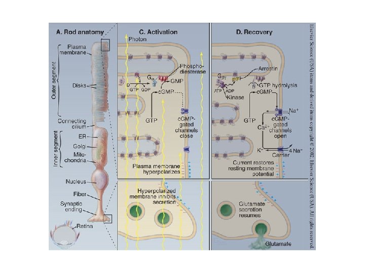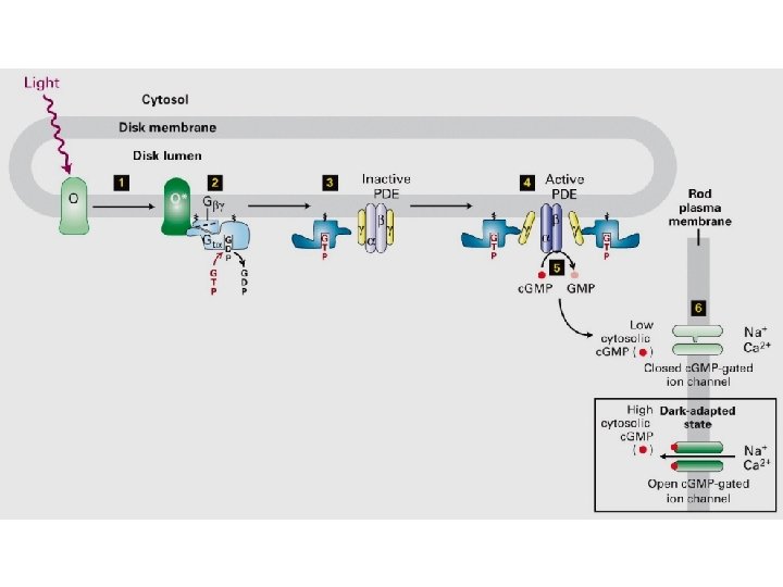 One rhodopsin molecule Absorbs one photon 500 Transducin molecules are activated 500 Phospodiesterase molecules are activated 105 c. GMP molecules are hydrolyzed 250 Na+ channels closed 106 -107 ions/sec are prevented from entering the cell for a period of 1 sec Rod cell membrane is hyperpolarized by 1 m. V