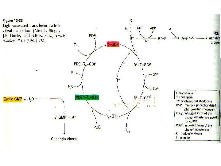 Transducin at 39 k. D; b 36 k. D; 8 k. D a In the dark transducin is in the GDP form the binding of GTP to transducin leads to the release of R* which enables it to catalyze the Activation of another molecule of transducin A single R* catalyzes the activation of 500 molecules of transducin, the first stage in the amplification of vision