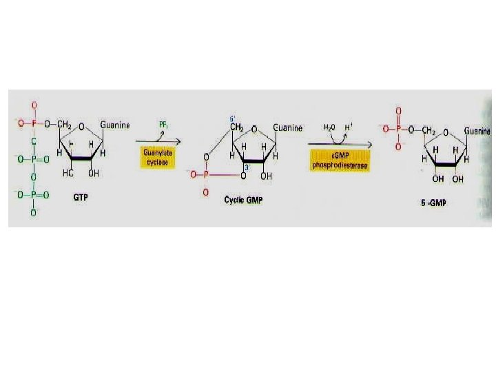 Activation of phosphodiesterase by Gat The binding of GTP switches on the phosphodiesterase (PDE) by relieving an inhibitory constraint. In the dark the two catalytic subunits a and b are held in check by a pair of inhibitory subunits ( ). By binding of Gat to the enzyme it removes the inhibitory subunits and the enzyme is activated a Inactive b Gat a b Gat Active The hydrolysis of c. GMP by phosphodiesterase is the second stage of of amplification