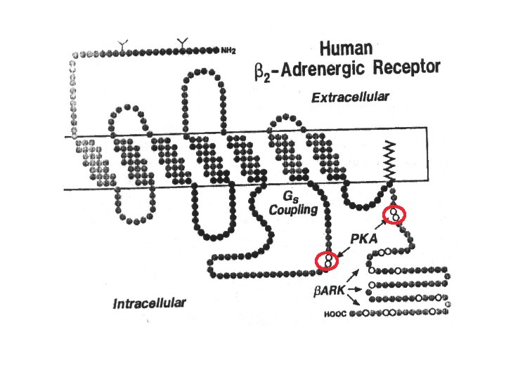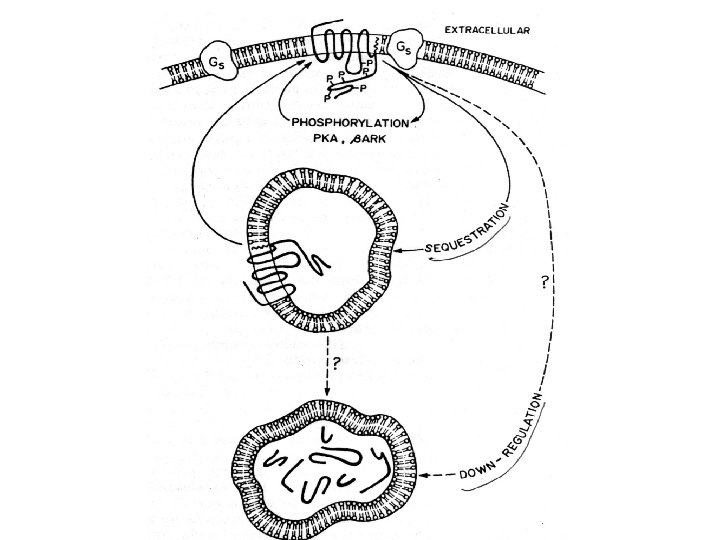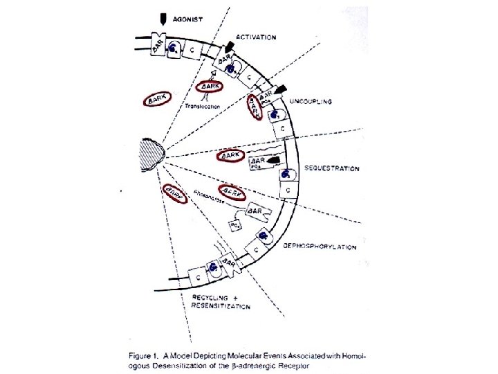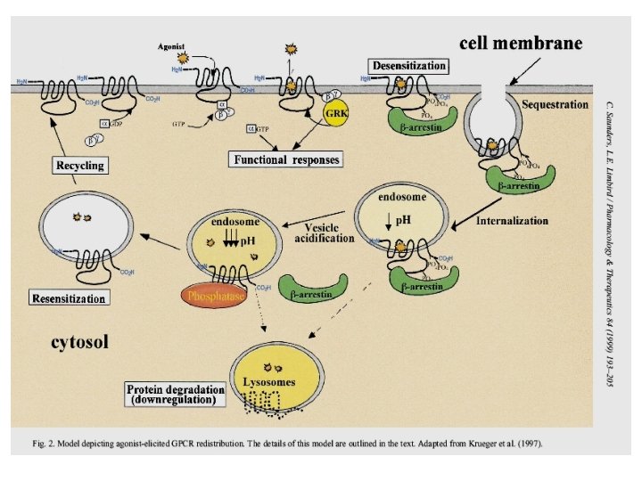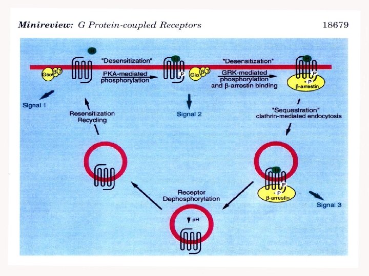 Termination of the signal One of the most important part of the signaling machinery is termination of the signal even in the presence of the stimulus This phenomenon is referred to as “desensitization” Such mechanisms operate at both the level of the receptor as well as down stream at the level of G-protein Rapid termination of the receptor signal is controlled by receptor phosphorylation which is mediated by second messenger-kinases PKA and PKC or by a distinct Receptor-kinsases (GRKs) together with arrestins
