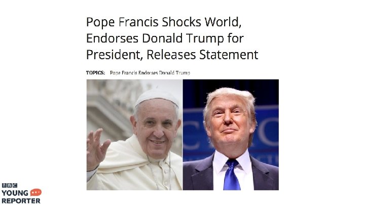 What is ‘fake’ news? BBC’s definition: False information distributed deliberately, usually for political or commercial purposes • Made up stories and information • Meant to be widely shared - perhaps to shock or scare • Its purpose is to persuade people to think a certain way or vote a certain way • Or to make money from advertising - clickbait
