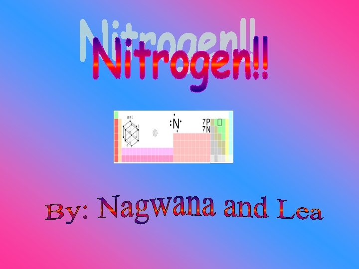 • All About Nitrogen= May 22, 2006 Monday http: //en. wikipedia. org/wiki/Nitrogen • History of Nitrogen= May 22, 2006 http: //education. jlab. org/itselemental/ele 007. html • Definition of Words= June 1, 2006 www. dictionary. com • Materials of Element= June 1, 2006 http: //www. chem 4 kids. com/files/elements/007_comps. html • Nitrogen Element Fact= June 5, 2006 http: //chemicool. com/elements/nitrogen. html • Pictures= June 6, 2006 http: //www. brooklyn. cuny. edu/bc/ahp/SDPS/Atom. Nitrogen. GIF http: //www. ew. govt. nz/enviroinfo/land/management/nutrients/images/nit rogen 4. gif