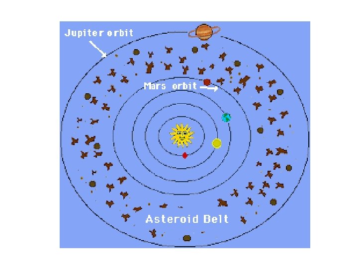 Other objects in our Solar System • Asteroids - Bit of rock that orbits around the sun, range in size from hundreds of km to mm • It can be thought of as what was "left over" after the Sun and all the planets were formed • Asteroid Belt – located between Mars and Jupiter • May have caused the extinction of dinosaurs and global climate change
