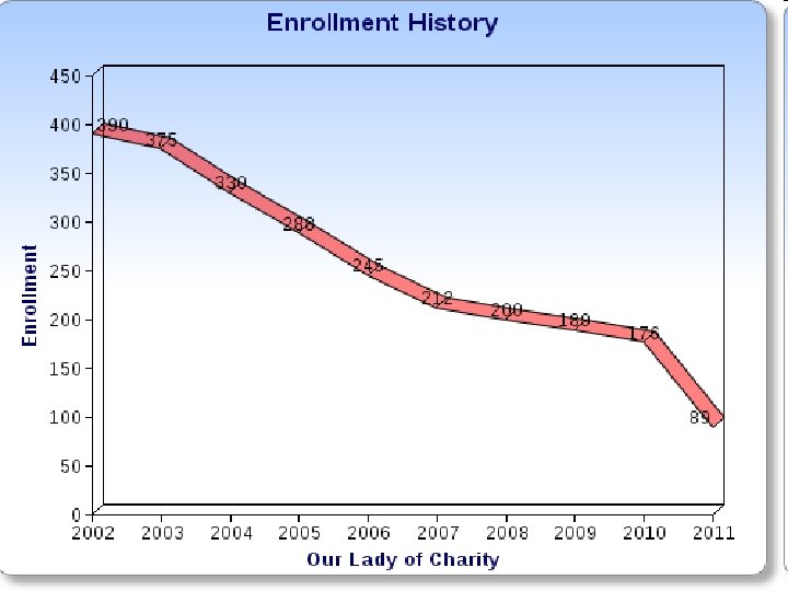 Current State of Our Lady of Charity Catholic School • 89 children re-registered • 33 children not re-registered • Schools under 250 struggle financially and begin to lose ability to provide all that is expected in the Standards for Quality Catholic Schools • Current challenge calls for an even higher tuition rate than previously stated