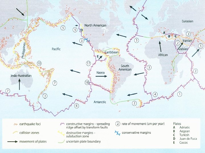 Theory of Plate Tectonics It was developed in the concepts of sea-floors spreading, continental drift, crustal structures, world patterns of seismic and volcanic activities. Surface of the Earth comprises a series of internally rigid but relatively thin plates. They are continuously in motion. All seismicity, vulcanicity and tectonic activities are associated with different motion between adjacent plates The plates (lithosphere) consist of crust and upper mantle. Beneath the lithosphere lies the soft, weak layer (Asthenosphere).