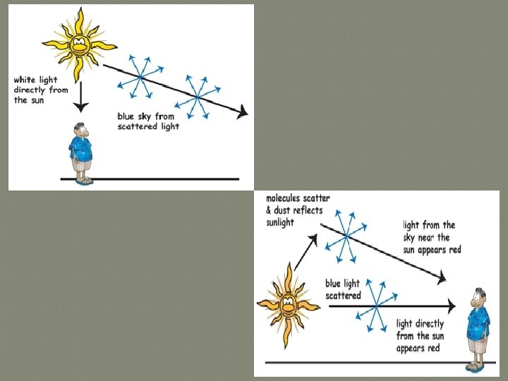 Why is the sky blue? �Example • Blue λ = 400 nm • Red λ = 700 nm • In Rayleigh Scattering �(700/400)4≈9. 4 �Blue light scatters almost 10 times more efficiently than red light