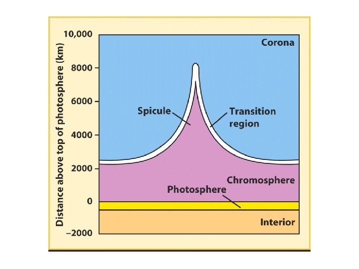 The chromosphere is characterized by spikes of rising gas • Above the photosphere is a layer of less dense but higher temperature gases called the chromosphere • Spicules extend upward from the photosphere into the chromosphere along the boundaries of supergranules