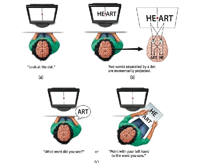 Problem • If we flash the picture of a cat to the right hemisphere of a split brain patient. . 1. Would each hemisphere observe the cat? 2. Would the person be able to say the word cat? 3. What would the person verbally report seeing? 4. How could the person correctly identify what was shown?