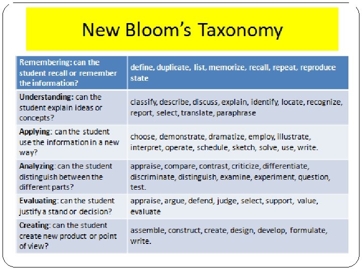 New Bloom’s Taxonomy 71 l from noun to verb forms l reflects a more active form of thinking
