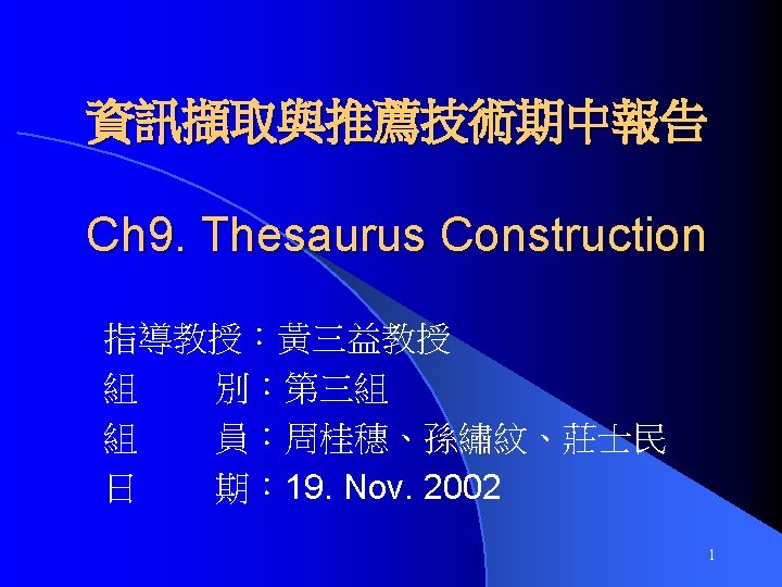 outline 1. Introduction 1) 2) 3) 4) 索引典(Thesaurus)定義 索引典結構 INSPEC thesaurus 索引典參照款目說明 2. Features of thesauri 1) 2) 3) 4) 5) 6) Coordination level Term relationships Number of entries for each term Specificity of vocabulary Control on term frequency of class members Normalization of vocabulary 3. Thesaurus Construction 1) Manual Thesaurus Construction 2) Automatic Thesaurus Construction 3. 2. 1 Thesaurus Construction from Text 1. 2. 3. 4. 5. Automatic Thesaurus Construction From a Collection of Document Items By Merging Existing Thesauri User Generated Thesaurus Construction of Vocabulary 3. 2. 2 Merging existing thesauri 4. Conclusion 2