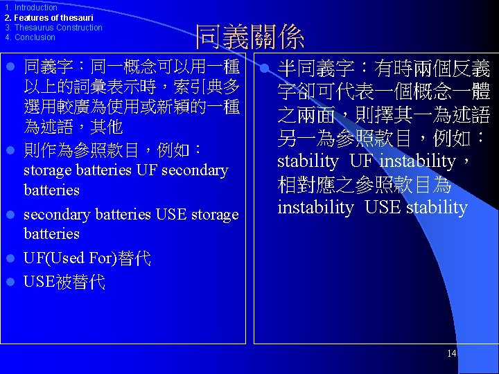 1. Introduction 2. Features of thesauri 3. Thesaurus Construction 4. Conclusion 2. 2 a) Equivalence relationships Equivalence relations include both synonymy(同 義字) and quasi-synonymy(半同義字). For example: genetics(遺傳) and heredity; harshness and tenderness 13
