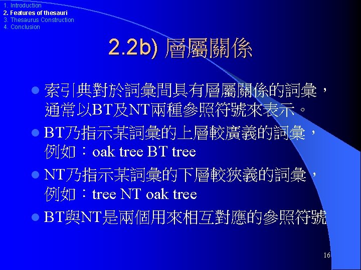 1. Introduction 2. Features of thesauri 3. Thesaurus Construction 4. Conclusion 2. 2 b) Hierarchical relationships 層級關係 A typical example of a hierarchical relation is genus(屬)-species(種), such as ”dog” and “german shepherd(牧羊犬近親). ” 15