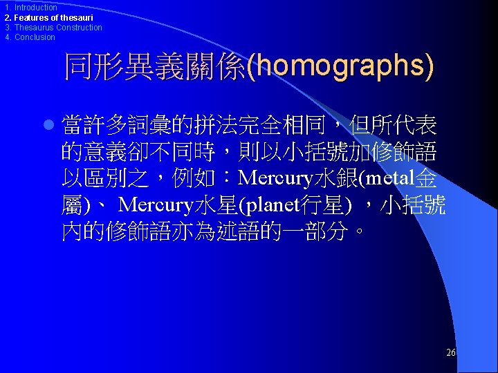 1. Introduction 2. Features of thesauri 3. Thesaurus Construction 4. Conclusion 2. 3 Number of entries for each term It is in general preferable to have a single entry for each thesaurus term. However , this is seldom achieved due to the presence of homographs—words with multiple meanings. 2. In a manually constructed thesaurus such as INSPEC, this problem is resolved by the use of parenthetical qualifiers(括弧限定語), as in the pair of homographs, bonds化學鍵(chemical) and bonds粘合劑(adhesive膠帶). 3. However, this is hard to achieve automatically. 1. 25