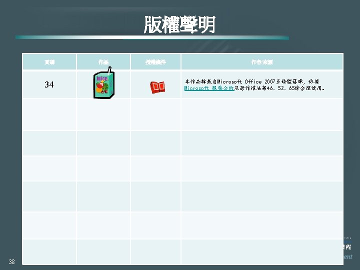 版權聲明 頁碼 37 作品 授權條件 作者/來源 3, 18 Wikimedia Commons 本作品轉載自 http: //commons. wikimedia. org/wiki/File: Dell_Logo. png,瀏 覽日期 2011/12/28。 15 Flickr. com,作者:Mooi。 (http: //www. flickr. com/photos/mooitw/4086539757/sizes/t/i n/photostream/),本作品採取創用CC「姓名標示-非商業性-相 同方式分享」2. 0版授權釋出。 15 本作品轉載自Microsoft Office 2007多媒體藝廊,依據 Microsoft 服務合約及著作權法第 46、52、65條合理使用。 18 本作品轉載自WIKIPEDIA (http: //en. wikipedia. org/wiki/File: Amazon. com-Logo. svg), 瀏覽日期 2011/11/29。 21 VECTORLOGO(http: //www. allfreelogo. com/logo/hp-logo. html) 本作品轉載自VECTORLOGO網站,依據其版權聲明 (http: //www. allfreelogo. com/privacy-policy/)與著作權法第 46、52、65條合理使用。 21 本作品轉載自WIKIPEDIA (http: //zh. wikipedia. org/wiki/File: IBM_logo. svg),瀏覽日 期 2012/3/8。 21 本作品轉載自WIKIPEDIA (http: //en. wikipedia. org/wiki/File: Toshiba_logo. svg),瀏 覽日期 2011/11/29。