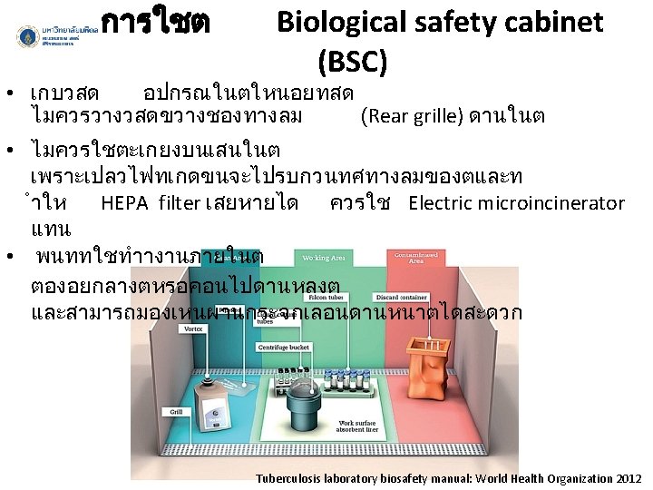 • Safety equipment used to process specimens in TB laboratories, potential hazards and associated safety features Tuberculosis laboratory biosafety manual: World Health Organization 2012