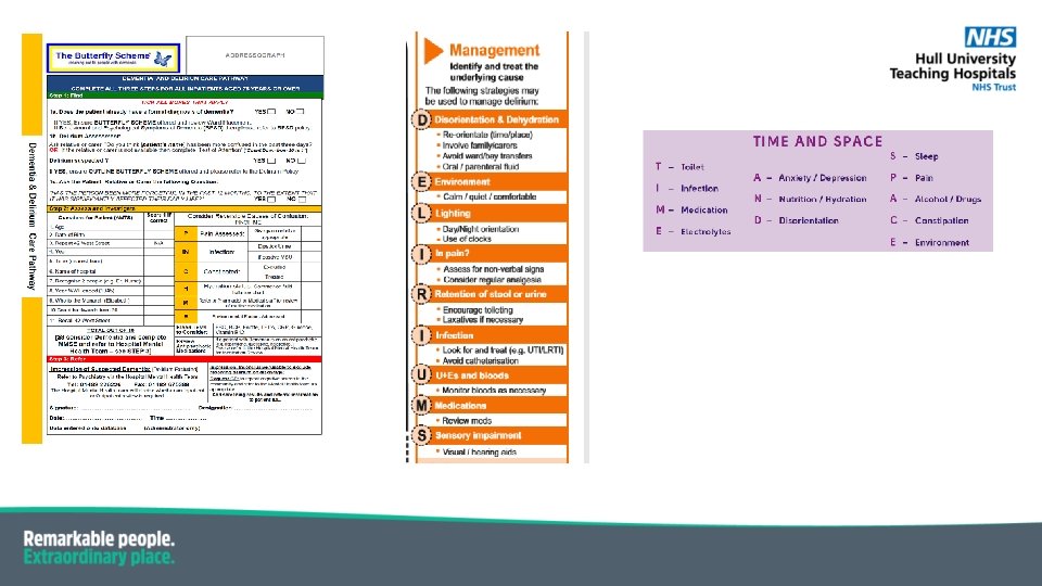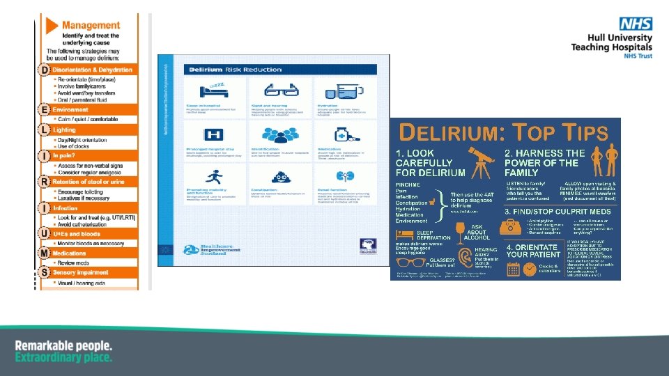 Delirium management • Apart from treating the underlying cause… 1. Patient orientation • Clocks • Calendars • Familiar objects from home • Verbal orientation on every intervention • Avoid room/ward moves • Clear signage • Good lighting